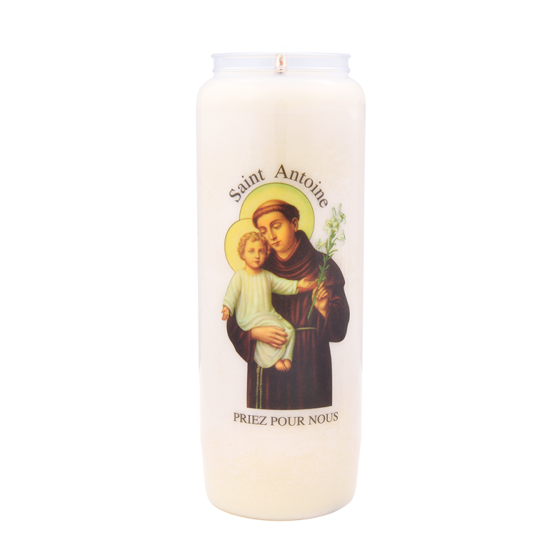 Neuvaine décorée de forme cylindrique fabriquée avec de la cire 100% végétale. Le décor Saint Antoine est une étiquette adhésive en quadrichromie d’excellente qualité. Le contenant est un godet en plastique recyclable. La durée de combustion est d’environ 9 jours.