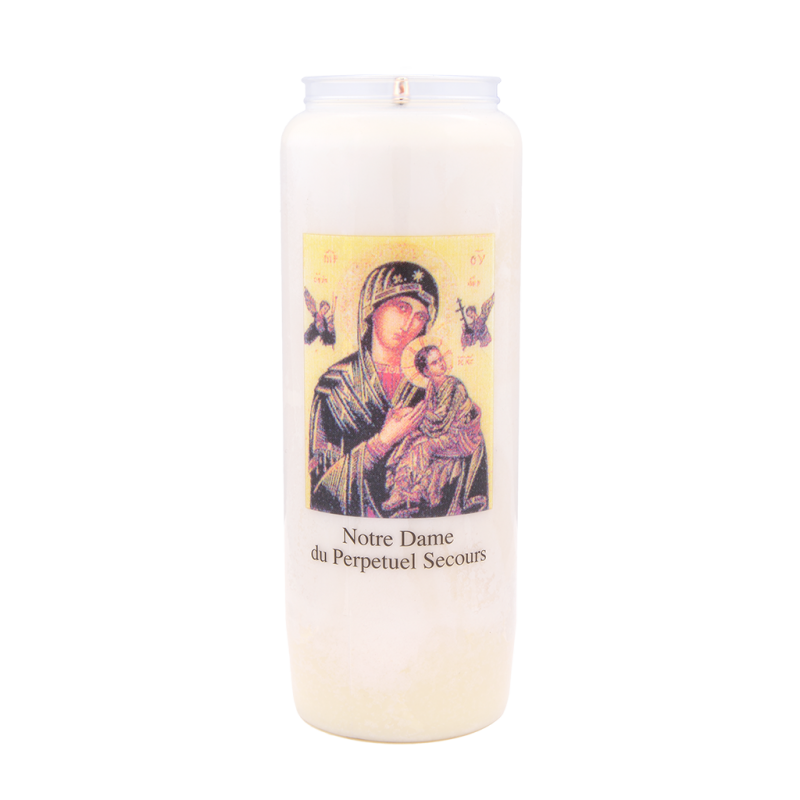 Neuvaine décorée de forme cylindrique fabriquée avec de la cire 100% végétale. Le décor Notre Dame du Perpétuel Secours est une étiquette adhésive en quadrichromie d’excellente qualité. Le contenant est un godet en plastique recyclable. La durée de combustion est d’environ 9 jours.