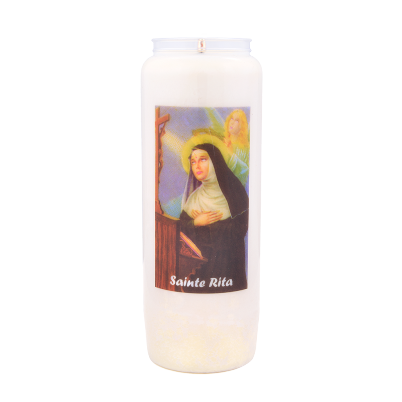 Neuvaine décorée de forme cylindrique fabriquée avec de la cire 100% végétale. Le décor Sainte Rita est une étiquette adhésive en quadrichromie d’excellente qualité. Le contenant est un godet en plastique recyclable. La durée de combustion est d’environ 9 jours.