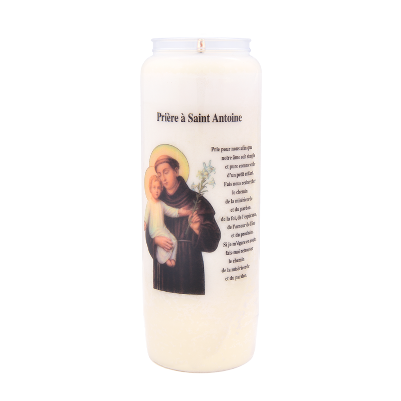 Neuvaine décorée de forme cylindrique fabriquée avec de la cire 100% végétale. Le décor Prière à Saint Antoine est une étiquette adhésive en quadrichromie d’excellente qualité. Le contenant est un godet en plastique recyclable. La durée de combustion est d’environ 9 jours.
