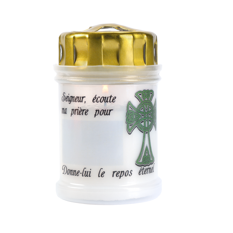 Veilleuse d'extérieur blanche de forme cylindrique VS9 fabriquée avec de la cire minérale. Le contenant est un godet en polycarbonate recyclable. Le décor "Seigneur, écoute ma prière pour ......" est une étiquette adhésive en quadrichromie d'excellente qualité. La durée de combustion est d’environ 50 heures.