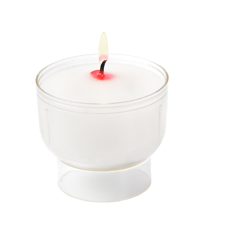 Veilleuse votive blanche de forme tulipe V4 fabriquée avec de la cire minérale. Le contenant est un godet en polycarbonate recyclable. La durée de combustion est d’environ 9 heures.