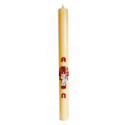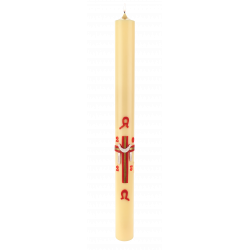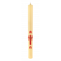 Le Cierge Pascal est un grand cierge orné d'une croix rouge et décoré selon plusieurs motifs, que l'on béni et allume solennellement la nuit de Pâques. Ce modèle avec le motif LA CROIX AGNEAU est un nouveau décor 2026.