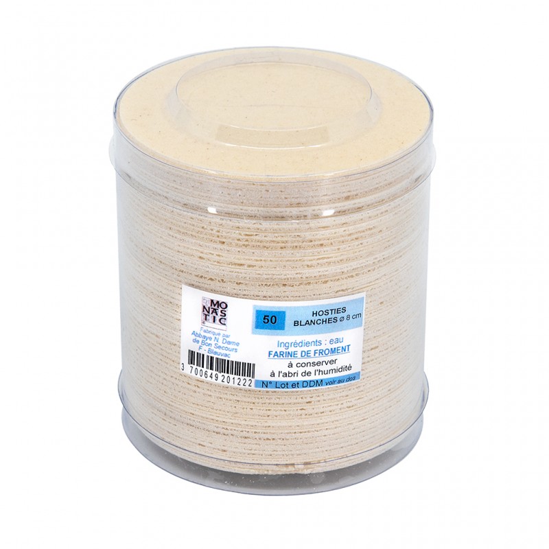 Blister de 50 hosties blanches de diamètre 80 mm.