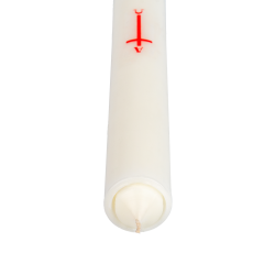 Cierge de Profession de Foi blanc avec la tête creuse ,un procédé qui évite tout désagrément issue de la tenue en main et de la combustion, diamètre 45mm, hauteur 25cm. fabriqué avec de la cire minérale sur lequel nous avons posé une étiquette adhésive, décor croix alpha et oméga rouge