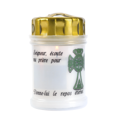 Veilleuse d'extérieur blanche de forme cylindrique VS9 fabriquée avec de la cire minérale. Le contenant est un godet en polycarbonate recyclable. Le décor "Seigneur, écoute ma prière pour ......" est une étiquette adhésive en quadrichromie d'excellente qualité. La durée de combustion est d’environ 50 heures.